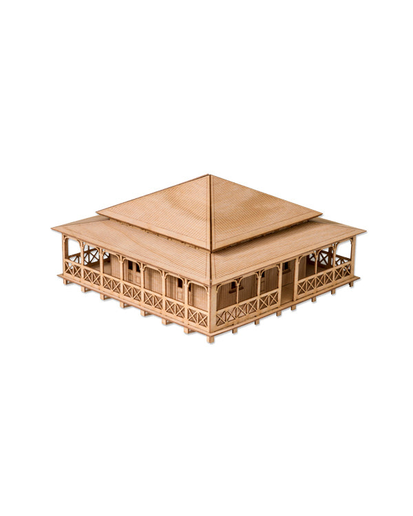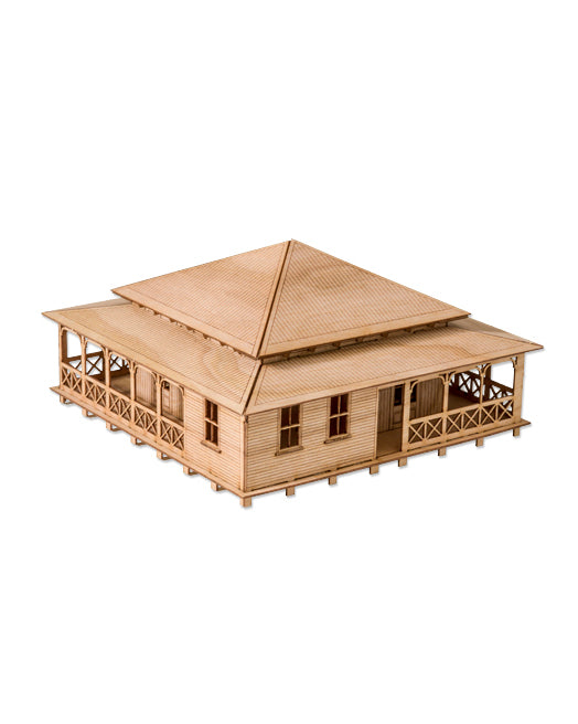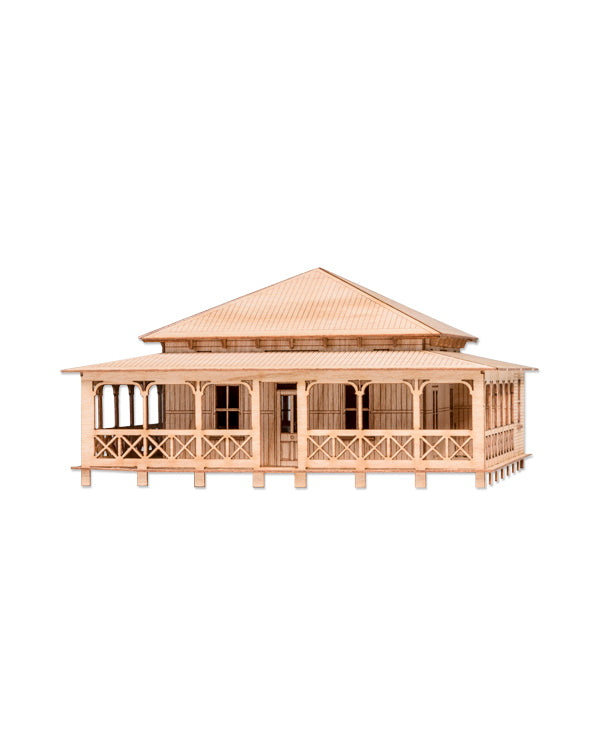 With its pyramid-style roof and stepped-down verandah the Queenslander's appearance is distinctive and almost iconic. This model features a distinctive diamond-style veranda rail. It was ideally suited to the local conditions with French doors opening out onto a verandah that wraps around all four sides of the building. Walls are vertical VJ boards with a horizontal chair rail. Windows are all double-hung sashes. A kitchen was often accommodated in the rear corner of the verandah.