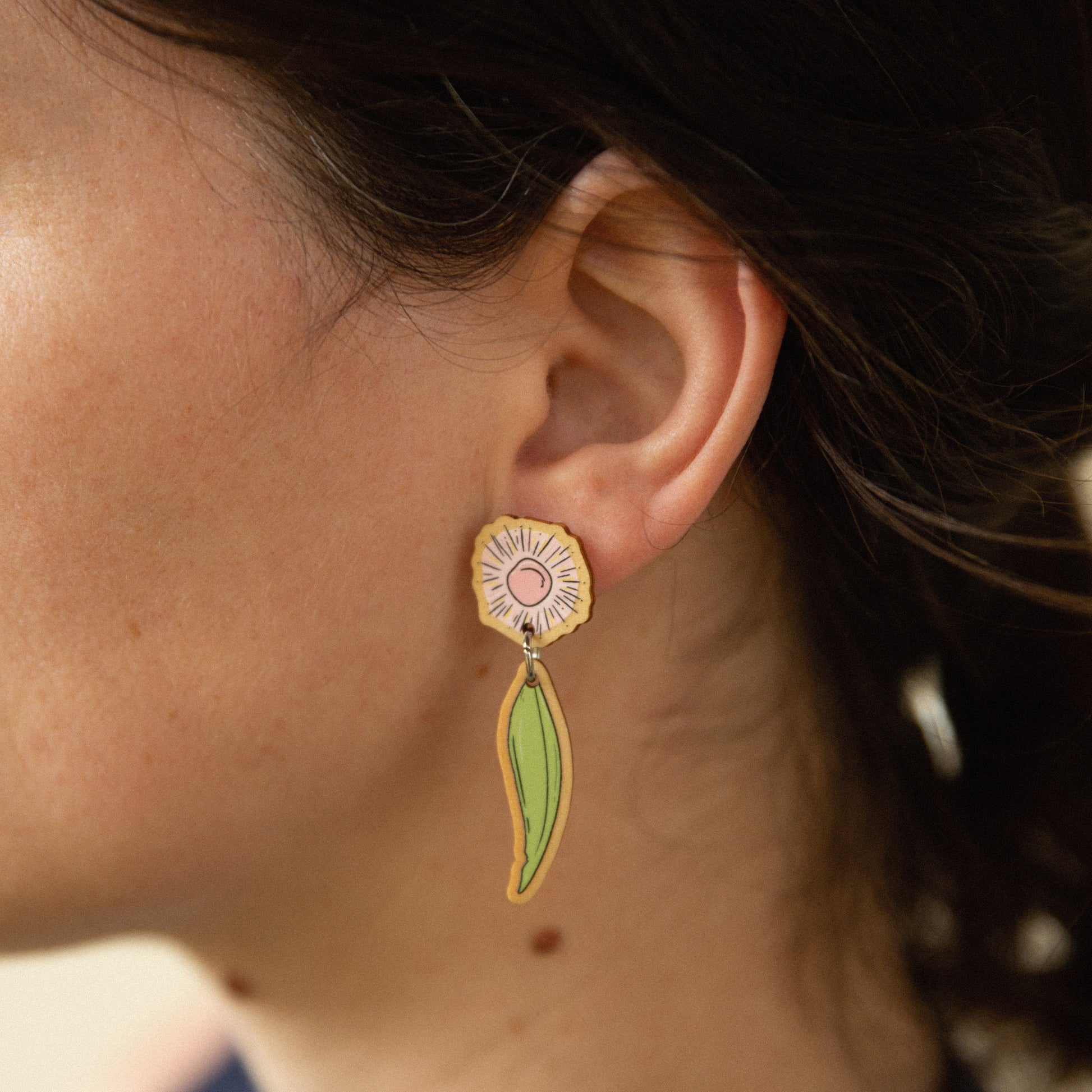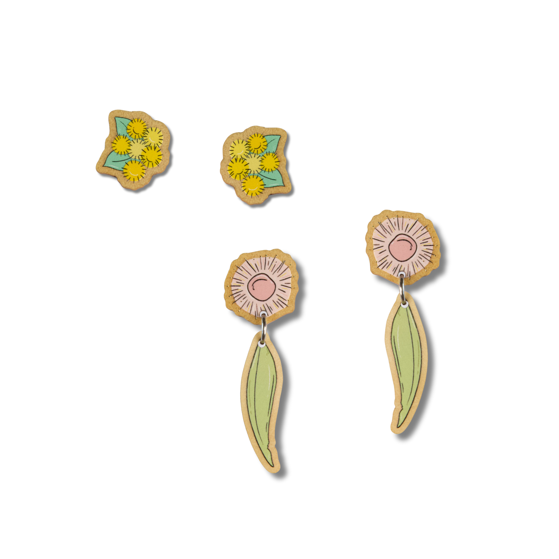 Dimensions: wattle 1.4cm W, flowering gum 4cm hang length