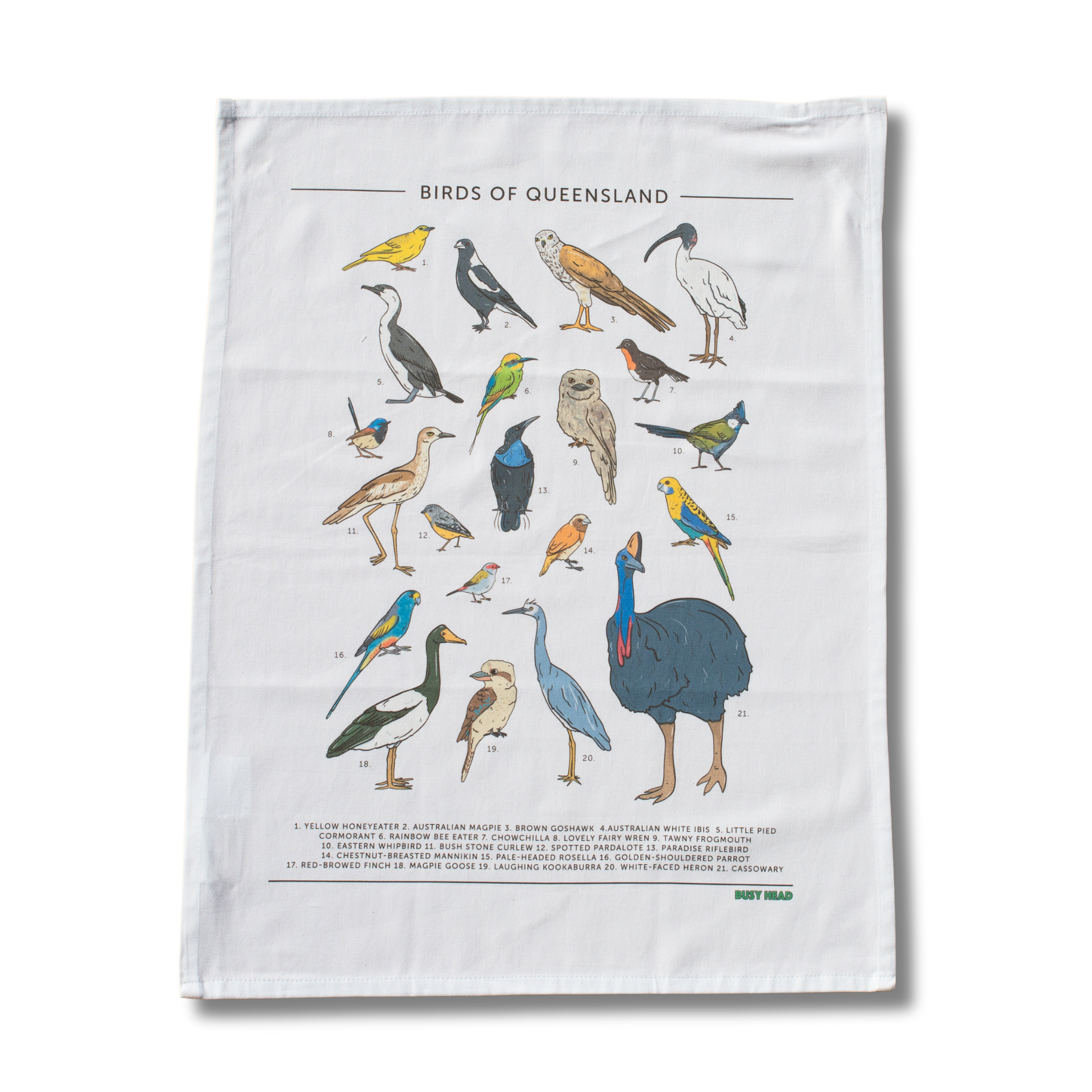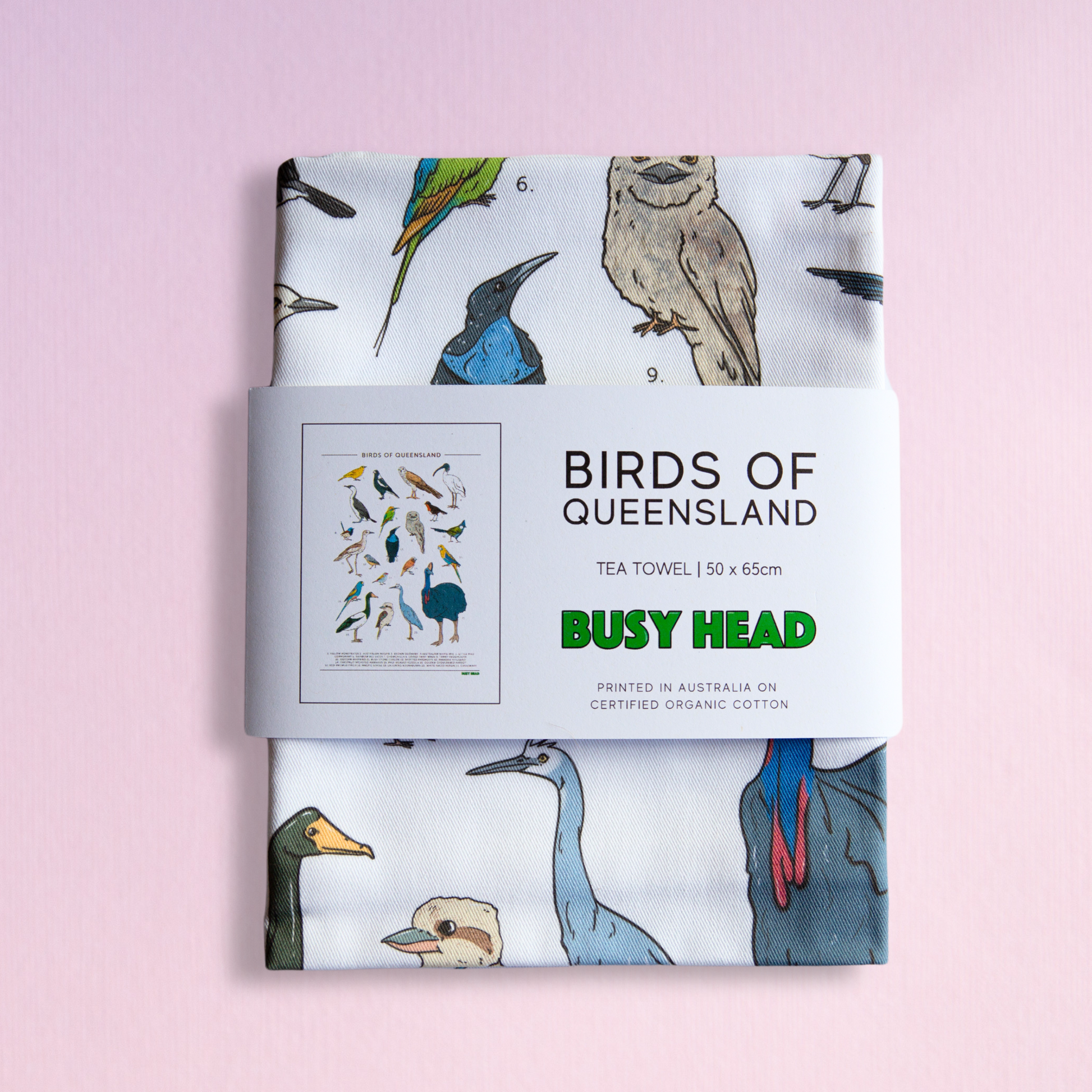 White organic cotton tea towel featuring original illustration by Brisbane based artist Busy Head.