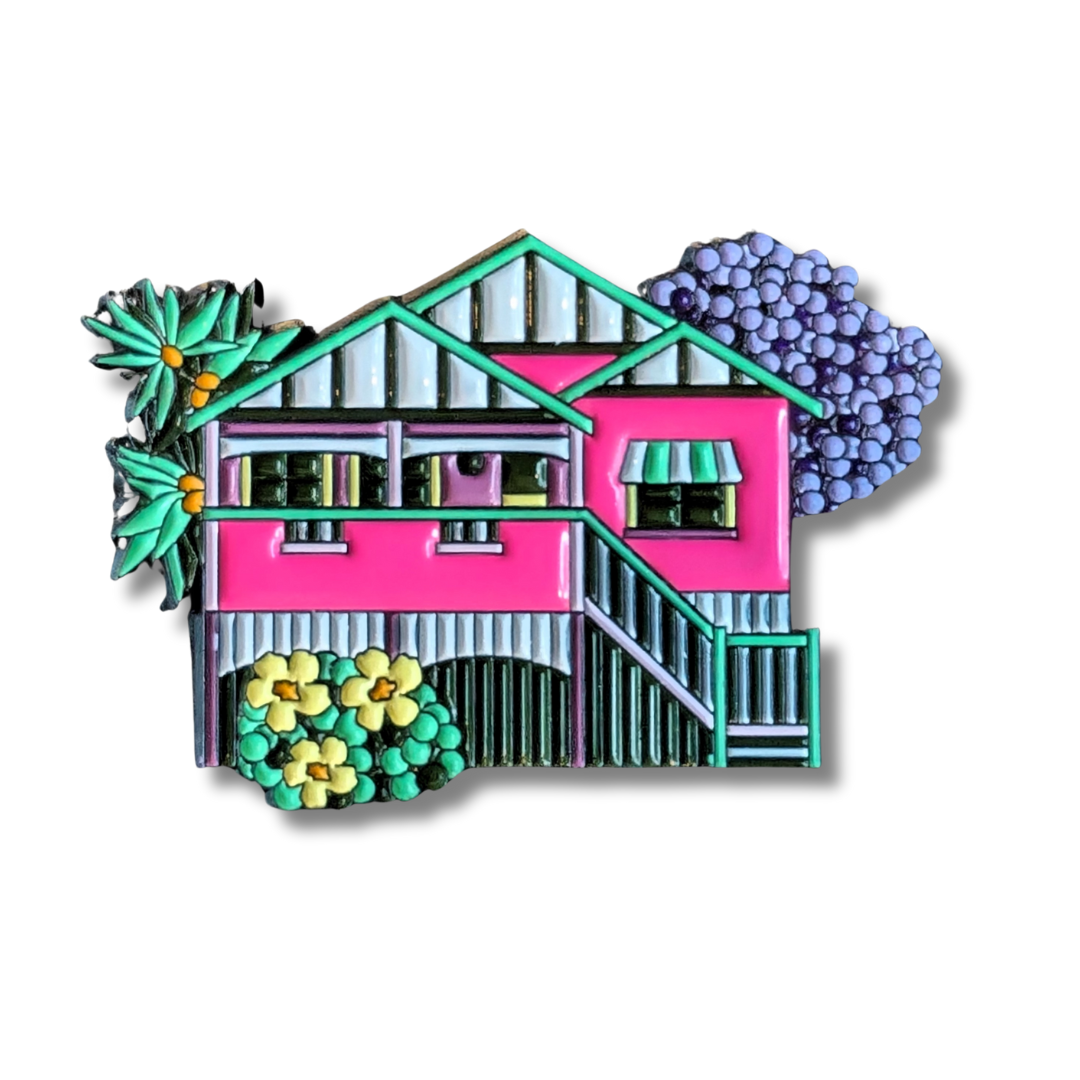 Enamel pins featuring iconic Queenslander-style houses as featured in the paintings of talented Brisbane-based artist, Debra Hood.