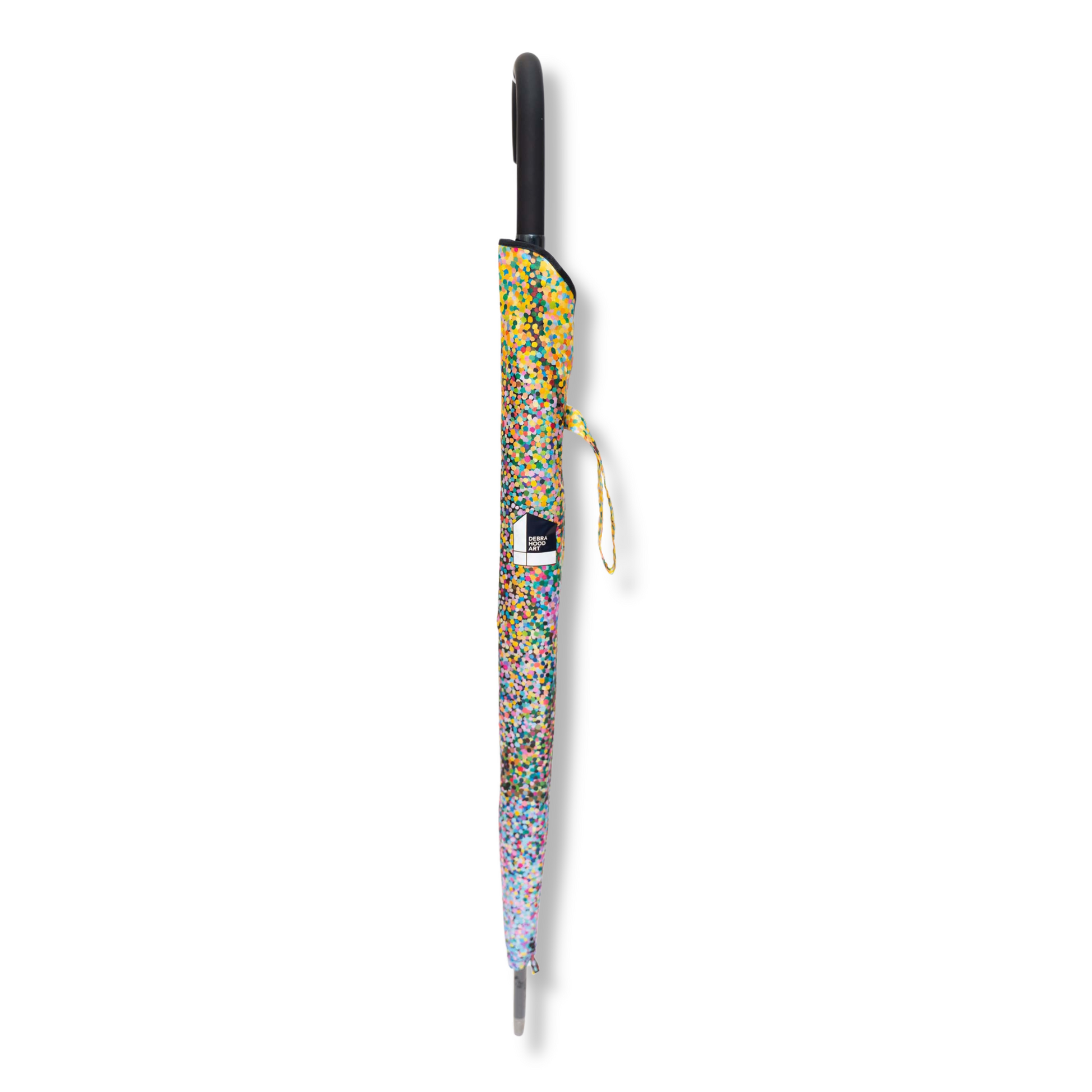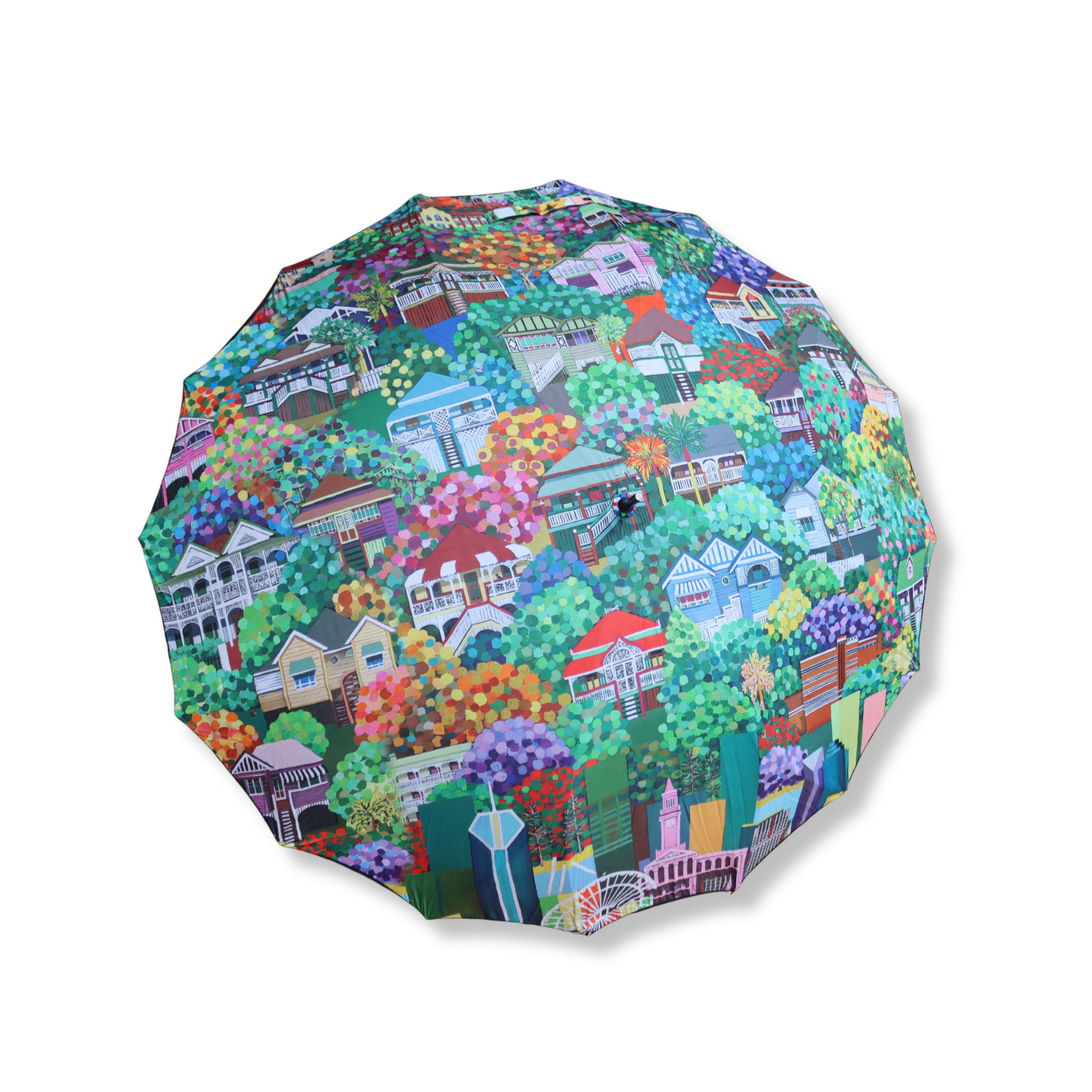 This vibrant umbrella showcases Debra Hood’s breathtaking artwork Saffron Sunset Over Brisbane and comes with a fun Confetti print cover for protection. Its new windproof design combines beauty with practicality.
