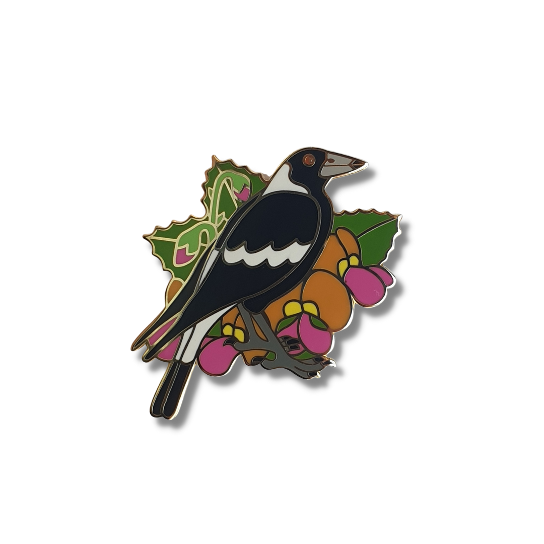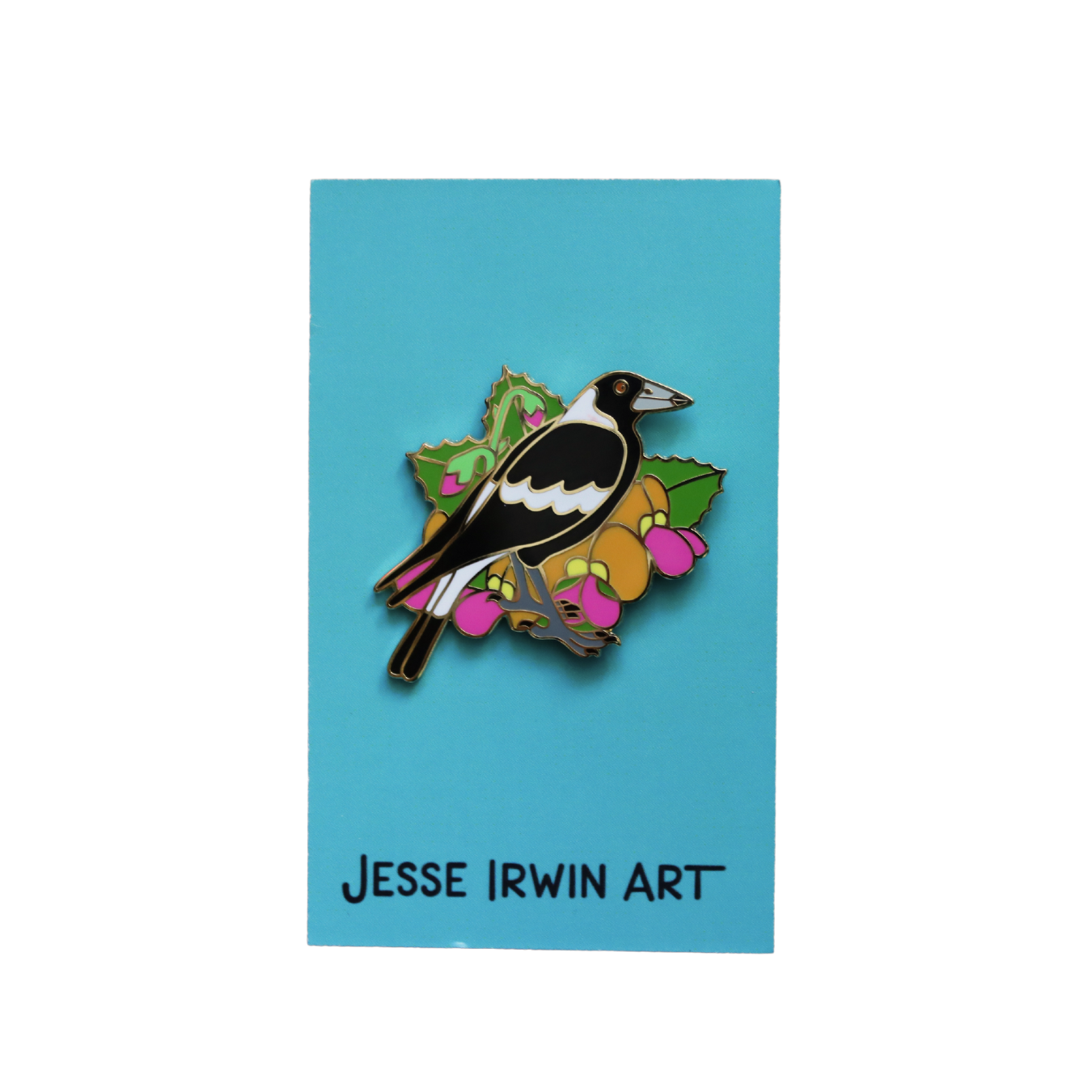 Introducing the Jesse Irwin magpie enamel pin, a beautifully handcrafted accessory designed in Brisbane.